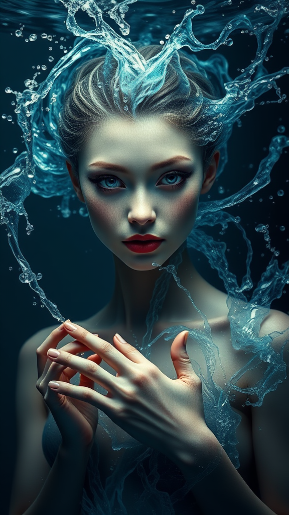 Elegant woman formed from flowing water, ultra-realistic, fantasy-themed art, intensely detailed, lifelike eyes, dynamic water splashes, mysterious illumination, 8k resolution, UHD, HDR, Model: Dark Sushi 25D, surreal yet beautiful, distinctive appearance, elongated features subtly integrated, gracefully extended neck, hands with unique elegance, pristine and sharp focus, full frame, clarity and depth, free of digital noise, abstraction, or text overlays, complete composition, artful continuity, seamless visual without division.