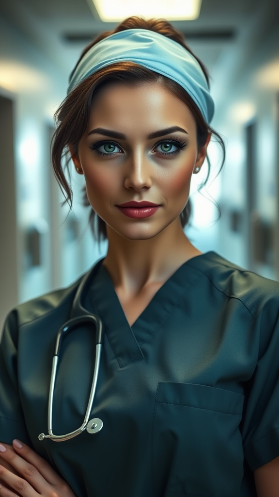 Elegant woman in a surgical uniform exuding an engaging charm, set against a hospital backdrop, making direct eye contact, portrait-style photography, with meticulously detailed skin, highly photorealistic, full-length capture in 8k resolution, showcasing high-detail RAW color work. She has a striking piercing, with diffused soft lighting enhancing her features, and a shallow depth of field ensuring sharp focus, embracing hyperrealism. There is a cinematic quality to the lighting, crafted with skill, excluding elements such as low resolution, poor quality, digital noise, awkward anatomy, distorted features, and any visual artifacts, ensuring an aesthetically pleasing, well-composed image devoid of any imperfections such as unnecessary limbs or features.
