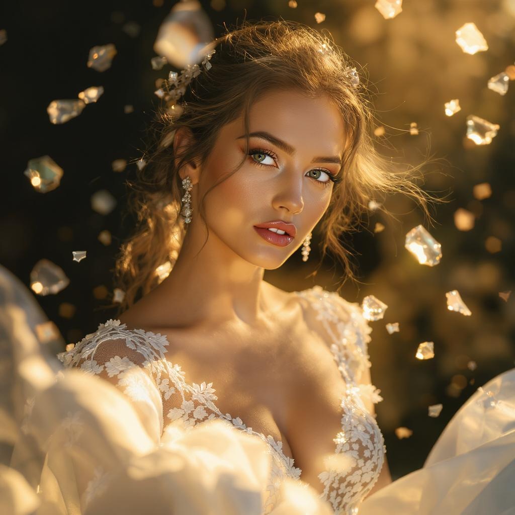 Elegant woman in an intricately detailed white lace dress, surrounded by shimmering fragments of glass gently floating in the air, bathed in warm, golden sunlight. The scene captures a soft, ethereal atmosphere with a powerful, cinematic composition, highlighting her perfect anatomy and expressive features. The shallow depth of field blurs the background, emphasizing her presence in this ultra-realistic, high-definition portrait. Light gleams off the glass and fabric, creating dynamic reflections and a sense of motion, conveying a masterpiece of professional photography where dreamlike beauty intertwines with reality.
