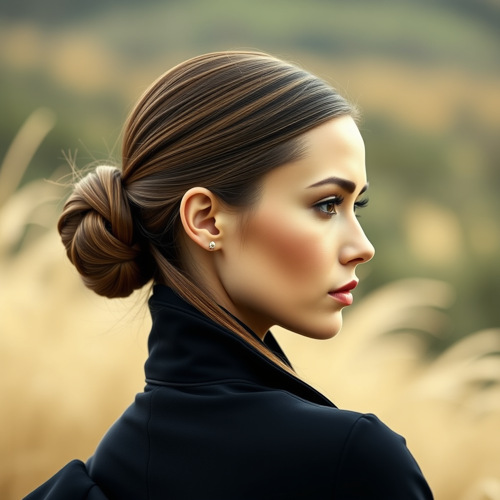 Elegant woman with long hair styled into a sleek bun against a natural backdrop, featuring a headshot portrait capturing minimalist beauty, embodying high fashion and editorial style, akin to a Vogue trend. The image reflects the aesthetics of Unsplash with detailed intricacy, elegance, and hyperrealism, reminiscent of a 3D model crafted in Maya. Her face and form are symmetrical, captured in high-resolution 4k, showcasing refined texture and elegance. The composition avoids any distortion, maintaining clarity and focus on a single, graceful figure with natural hair color.