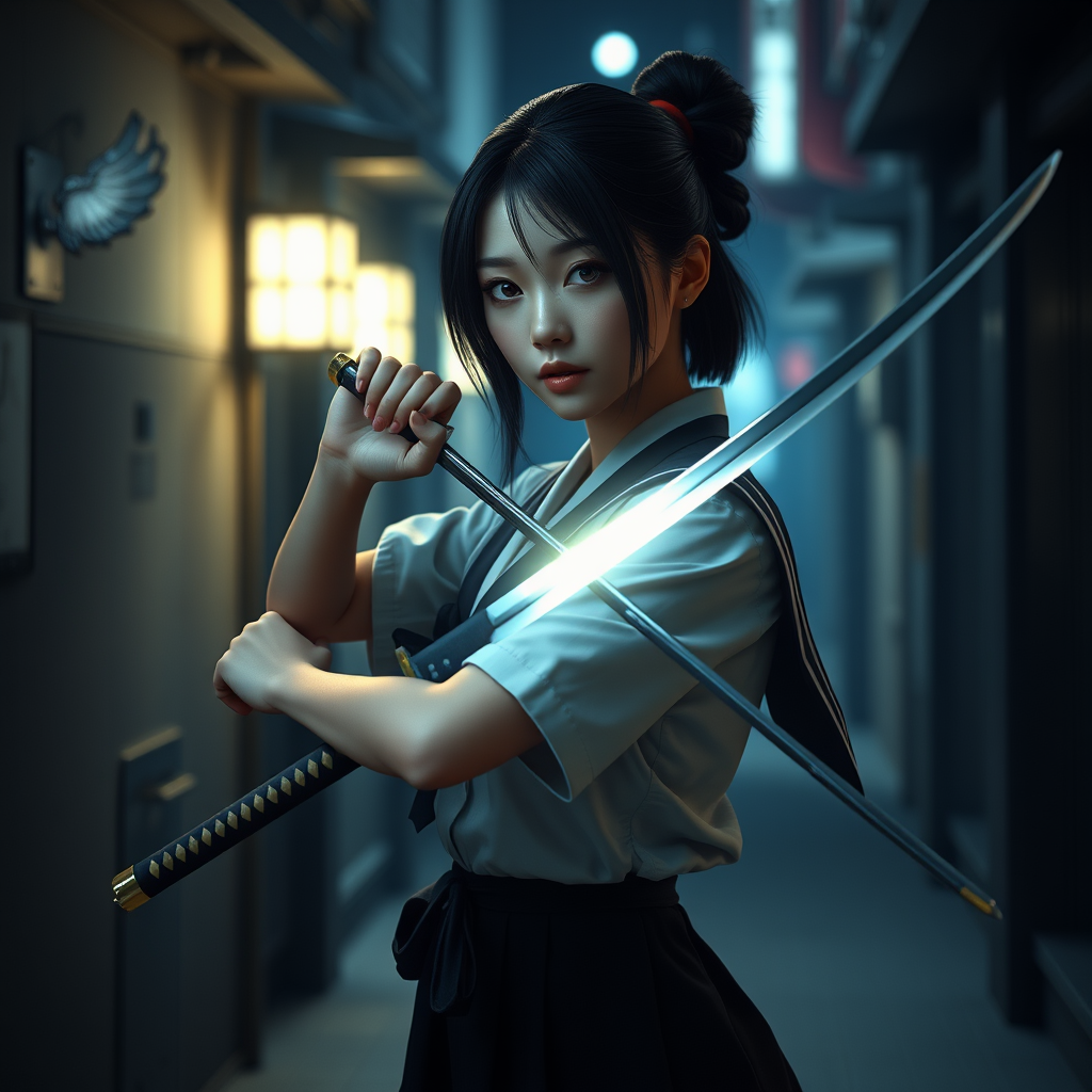 Elegant young Japanese woman in a school uniform, wielding a shining katana in an atmospheric, shadowy alley, cinematic, realistic 3D render, created in Unreal Engine, ultra-high detail, --ar 9:16 --niji 5 --style dynamic --s 180, adding subtle ethereal glow and a hint of mystery.