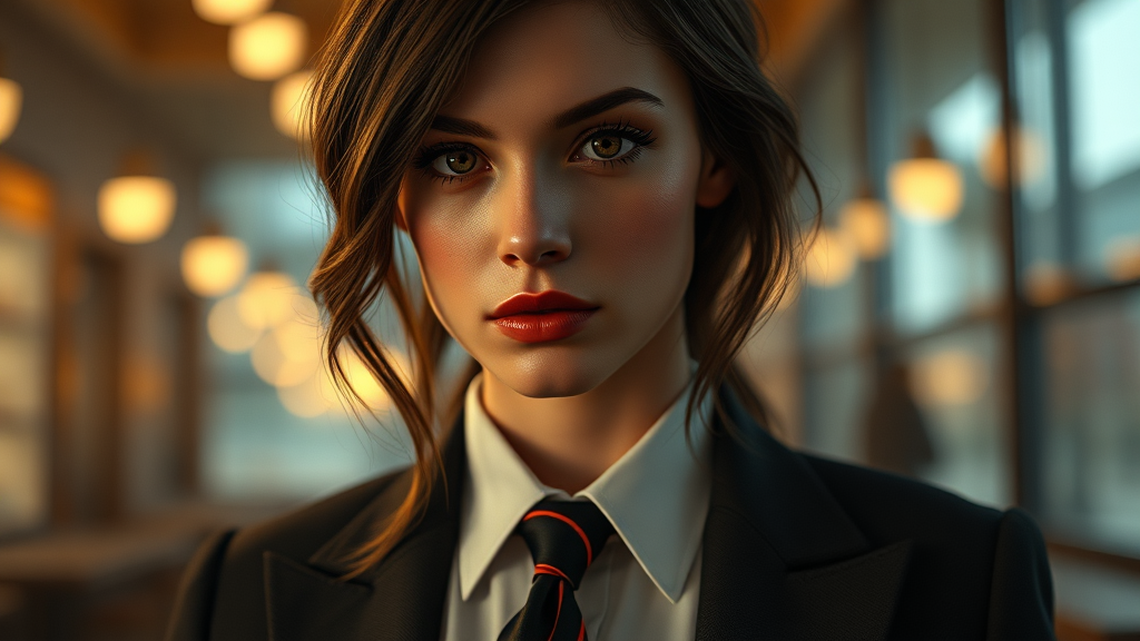 Elegant young woman in an open blazer and tie, exuding sophistication and grace, with intricate detailing and photorealistic features. Captured with cinematic and dramatic volumetric lighting in a 150mm octane render. Her eyes are a striking shade of red, and she has subtle freckles enhancing her lifelike appearance. The ambiance is reminiscent of artstation's trending photorealistic and hyper-detailed masterpieces, with the quality akin to a photograph taken with a high-end Hasselblad camera. The scene has a tasteful touch of artistic imperfections and subtle airbrushing, featuring uniquely styled elements and an ambient atmosphere. The composition feels natural and captures a moment of poised elegance with a touch of the avant-garde.