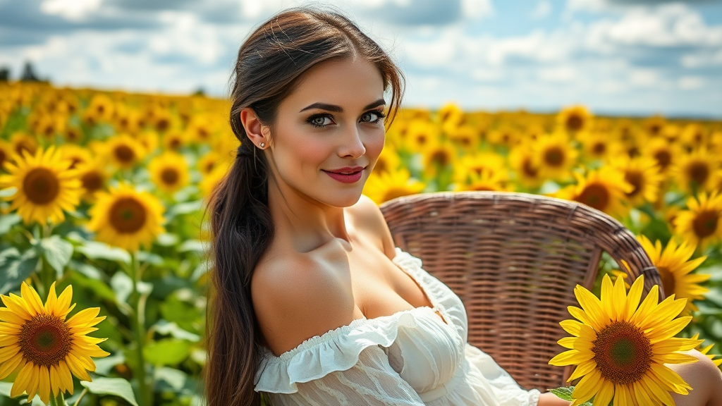 Elegantly posed beautiful woman with long dark-brunette hair tied back in a low ponytail, light-blue eyes sparkling with warmth, and a fair complexion glowing in the sunlight, sits in a wicker chair, leaning to one side amidst a lush green field of sunflowers on a partly cloudy day, their bright yellow petals stretching up to the sky like a canvas of liquid gold.