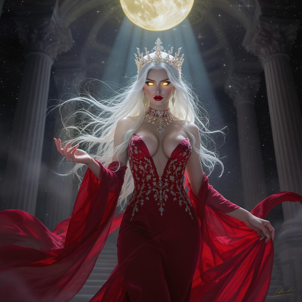 View this AI-generated image featuring elegantqueenazsharaandreadingspell_emotional_intense_passion_graceful_eyes_yellow_glowing_longwhitehair_sparkling_intricately_fashioned_longreddress_flowing_neoclassicalarchitecture_background_moonbeam_illumination_star_lighting_epic_composition_intricate_surfa