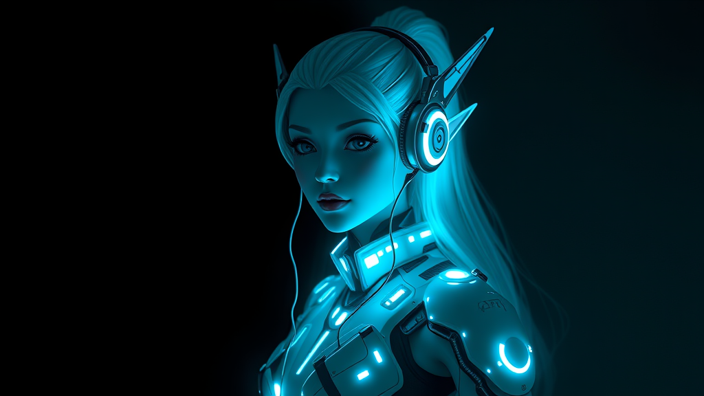 Elf Galadriel clad in a sleek robotic ensemble with illuminated circuits, standing against a shadowy backdrop. Her pointed ears are adorned with futuristic earphones, blending elven grace with cybernetic flair. Rendered in a style reminiscent of daz3d and anime art, infused with a palette of cyan and black, capturing the essence of a Ricoh FF-9D photograph. Her attire hints at sandalpunk influences with subtle babycore elements, creating a harmonious fusion of elegance and technology. The atmosphere is ethereal and enigmatic, evoking a sense of otherworldly allure.