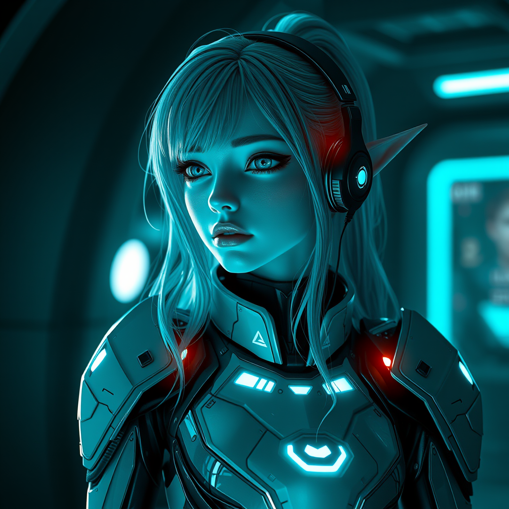Elf Galadriel in a futuristic robot outfit, set in a dark atmosphere, wearing earphones, portrayed in a daz3d style with anime art influences. The color palette is predominantly cyan and black, capturing a sandalpunk vibe with subtle babycore elements. The scene is envisioned through a ricoh ff-9d lens, emphasizing an ethereal, otherworldly aesthetic.