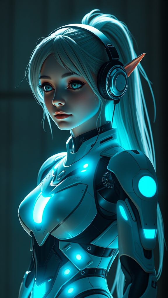Elf Galadriel in a futuristic robot outfit, standing in the shadows, adorned with earphones, styled with a blend of daz3d realism and anime art, featuring a color scheme of cyan and black. The scene captures her in a sandalpunk aesthetic, incorporating elements of babycore with a whimsical twist, as if photographed with a Ricoh FF-9D camera, emphasizing intricate details and contrasts --ar 4:5 --s 250 --v 6.0.