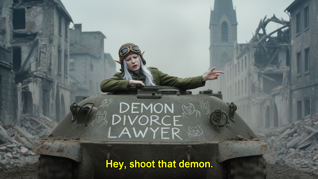 A high-fidelity cinematic still from a World War II film, shot on an ARRI Alexa Mini with a 85mm anamorphic lens at f/2.0. A photorealistic live-action version of Frieren from Frieren: Beyond Journey's End — she must have long silver-white hair flowing out from under her helmet, distinctive pointed elf ears clearly visible, youthful face with ancient tired eyes, delicate features, and pale skin. She is standing up through the top turret hatch of a muddy, battle-worn M4 Sherman tank, her upper body visible from the waist up above the turret roof. The tank is rolling slowly through a destroyed European town — crumbled stone buildings, rubble in the streets, dust hanging in the air, a church steeple half-collapsed in the background. Painted on the front of the tank's turret in messy white hand-painted military lettering is the name "DEMON DIVORCE LAWYER" with crude chalk doodles of dead demons around it. She wears period-accurate WW2 tanker gear — a scuffed leather tanker's helmet with goggles pushed up on her forehead, an olive drab field jacket. She is leaned way back, one arm draped lazily over the turret hatch, completely relaxed, her other hand gesturing loosely off-screen with a casual flick of the wrist. Her expression is utterly deadpan — half-lidded eyes, mouth barely open mid-sentence, zero urgency. At the bottom of the frame, a film-accurate yellow subtitle in a clean sans-serif font reads "Hey, shoot that demon." Muted desaturated war film color grading — crushed blacks, cold steel blues, muddy earth tones, slight film grain. Cinematic shallow depth of field. 16:9 cinematic aspect ratio. 4K resolution.