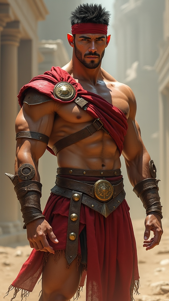 Elf. Solar Elf. Gladiator. Warrior. Hypermasculine Caucasian male of Roman heritage. Short but stocky, muscular, sinewy, well defined. Broad shouldered, broad chested, narrow waist, strong powerful legs. Well tanned skin from being in the hot sun. Sweaty, hard bodied. Black hair, short spiky fade style, scarlet headband tied around head. Elf ears. Strong brow and jaw, sculpted cheekbones and cleft in chin. Clean shaven, smooth face. Handsome, manly face. Amber eyes, hairy eyebrows {{{amber eyes}}}. Red metallic shoulder pads, red metallic arm guards strapped to his forearms. A brown leather O-ring harness strapped across his bare chest. A golden Roman metal pauldron strapped to his right shoulder. A brown leather studded belt around his waist. A brown leather gladiator kilt, just barely covering his genitals. Brown leather gladiator sandals strapped to his strong, muscular legs. He wears a short, sheer red cape with golden trim and accents. He carries a stylized scimitar sword and a shield. Full body pose. He radiates red solar energy/aura.