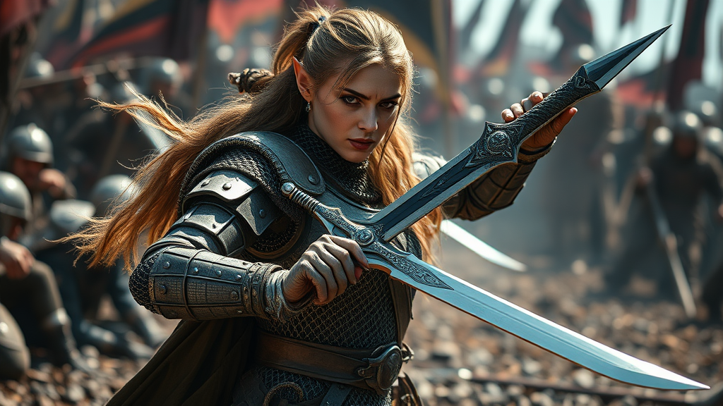 Elf warrior woman in intricately detailed chainmail armor wielding an elegant sword. She stands as a formidable presence amidst the chaos of the battlefield, captured in dynamic street photography. The perspective is low angle, emphasizing her strength, with natural lighting highlighting her fierce determination. Her form and features are perfectly articulated, portraying grace and power.