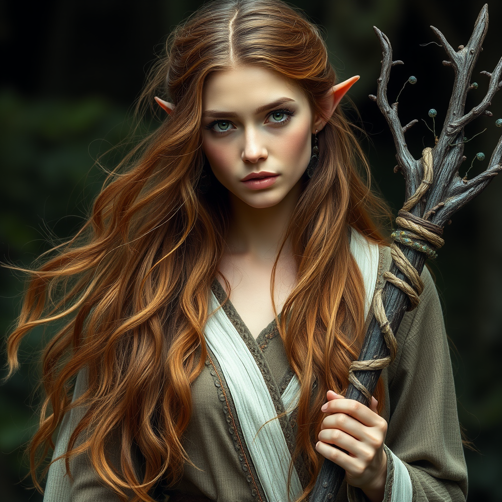 Elira, a gentle and wise elven druid, possesses a profound connection to the natural world and its inhabitants. Her flowing golden-brown locks and serene hazel eyes mirror her deep affinity with the earth and the life it sustains. Carrying a twisted, vine-embellished staff, Elira has the ability to communicate with animals and transform into various creatures. She uses her shape-shifting powers to shield and nurture the world around her. In a dramatic, cinematic setting highlighted by a vignette, she stands as a masterpiece of harmony with nature.