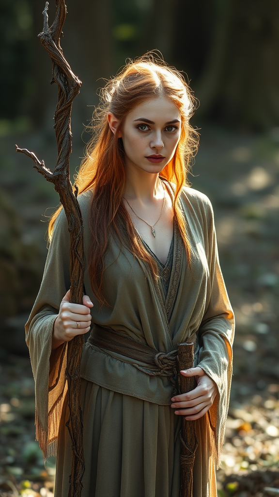 Elira is a serene and wise elven druid profoundly connected to the natural world and its creatures. Her auburn hair and tranquil, hazel eyes echo her profound bond with the earth and the life it nurtures. She carries a gnarled, vine-wrapped staff, allowing her to commune with animals and transform into various creatures. Utilizing her shape-shifting abilities, Elira diligently protects and heals the world around her. The scene captures a dramatic, cinematic moment of her standing centered, surrounded by a luminous vignette that highlights her presence as a masterpiece of harmony with nature.