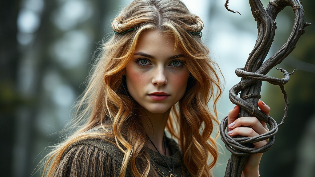 Elira is a wise and gentle elven druid, deeply connected to the natural world and its creatures. Her golden-brown hair and serene hazel eyes reflect her profound bond with the earth and the life it sustains. Equipped with a gnarled, vine-encircled staff, Elira can communicate with animals and transform into various creatures, using her shape-shifting abilities to safeguard and heal her surroundings. The scene is captured in a high-definition, cinematic style with a subtle vignette, highlighting her essence as a dramatic masterpiece.