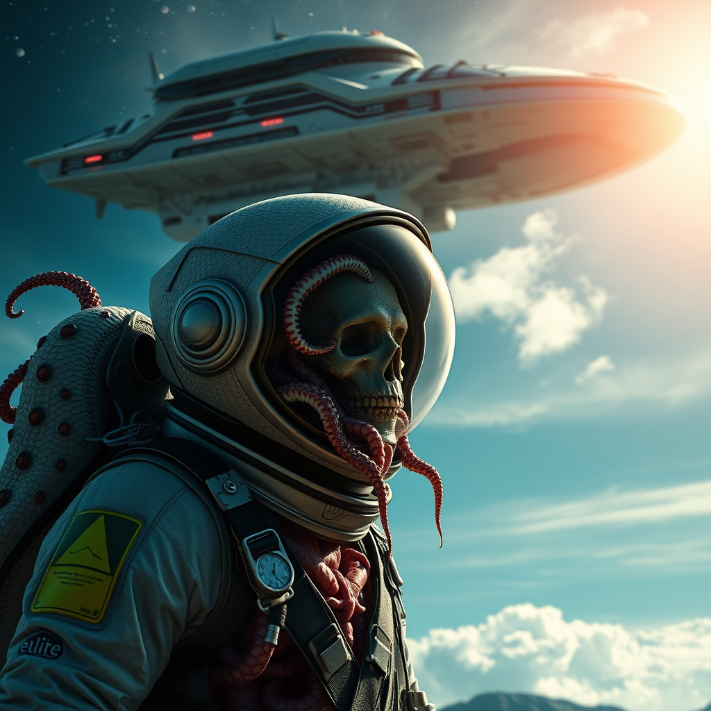 Elite photo depicting a space explorer adorned with intricate tentacles intertwined with visible internal organs against an alien sky backdrop, enhanced by a colossal spaceship hovering above; emphasis on hyperrealism with superfine detail showcasing glistening drool shimmering under the Ultra-HD 8K resolution.