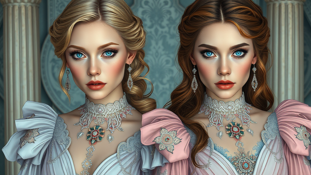 Elizabeth Olsen and Bryce Dallas Howard as Persephone in Greek mythology, featuring stunning and amazing eyes in pastel colors; both wearing elaborate dresses inspired by a one-piece character with symmetrical, full-body details. The scene is extremely detailed with cinematic lighting and high contrast, resembling the style of an Apterus oil painting. The illustration is suitable for an Artstation gallery, highlighting the intricate elements and mythical essence of the characters.