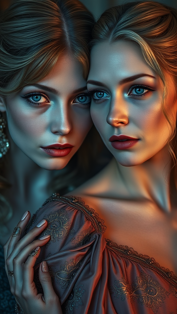 Elizabeth Olsen and Bryce Dallas Howard as Persephone in Greek mythology, captivating stunning eyes, pastel hues, intricate and elaborate gown, embodying a character with symmetry and grace, full-bodied portrayal, with exceptional detail, cinematic lighting, high contrast; an Artstation-worthy illustration reminiscent of Apterus style, blending portrait and Oil Painting aesthetics.