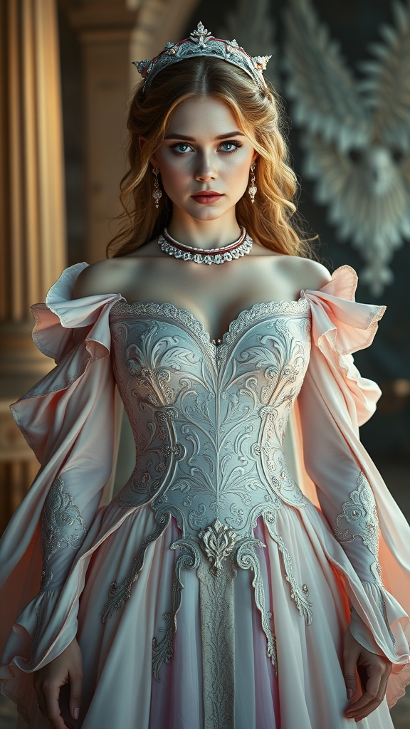 Elizabeth Olsen and Bryce Dallas Howard depicted as Persephone from Greek mythology, captivating and stunning eyes, dressed in an elaborate, symmetrically designed gown inspired by pastel colors, resembling a character from a one-piece narrative, portrayed in full body with intricate detail. The scene is illuminated with cinematic lighting and high contrast, reminiscent of Artstation illustrations. The composition carries the finesse of an oil painting, influenced by the artistic style of Apterus, creating a mesmerizing blend of mythological and modern aesthetics.