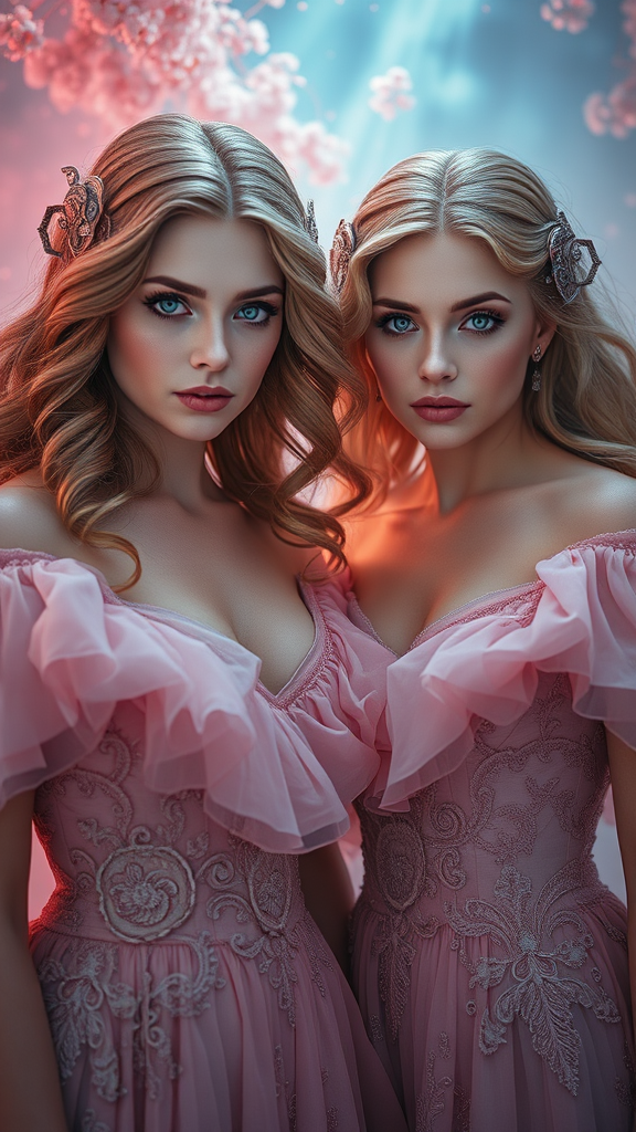 Elizabeth Olsen and Bryce Dallas Howard depicted as Persephone from Greek mythology, featuring stunning and mesmerizing eyes, immersed in a dreamy world of pastel colors. They are adorned in elaborate, intricately designed dresses, embodying the elegance and grace of a one-piece character with a symmetrical body. The scene is captured with extreme attention to detail, using cinematic lighting and high contrast to enhance their ethereal presence. The artwork is reminiscent of Apterus’s unique style, resembling an exquisite portrait and oil painting, worthy of a featured spot on ArtStation.