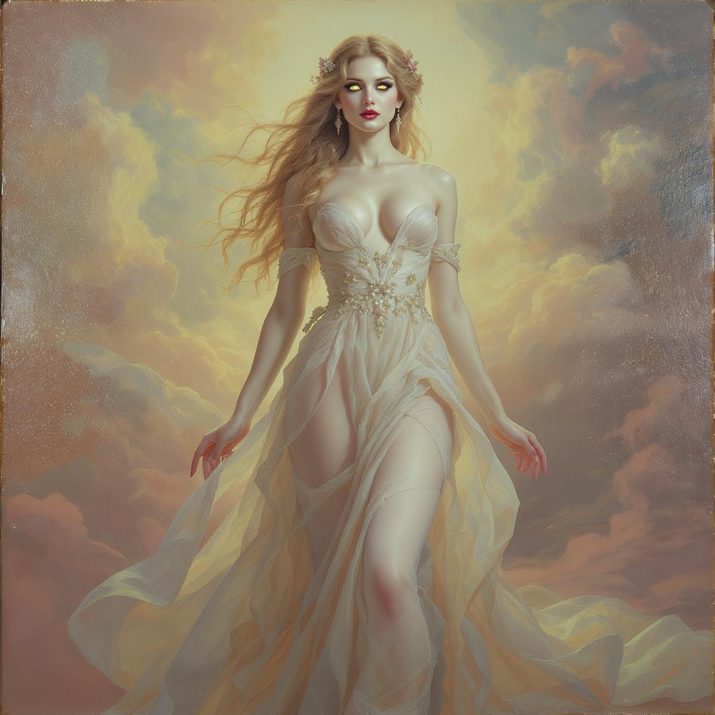 Elizabeth Olsen and Bryce Dallas Howard merged into a single ethereal Persephone from Greek mythology, possessing stunning, mesmerizing eyes. The scene is awash in soft pastel colors, capturing her in an elaborate gown reminiscent of a one-piece character's attire. Her figure is perfectly symmetrical, exuding balance and grace. The artwork is a full-body rendition, intricately detailed with cinematic lighting and high contrast, evoking a sense of depth and drama. This illustration, akin to an oil painting, channels the style of Apterus, offering an arresting visual composition that would feel at home on Artstation.