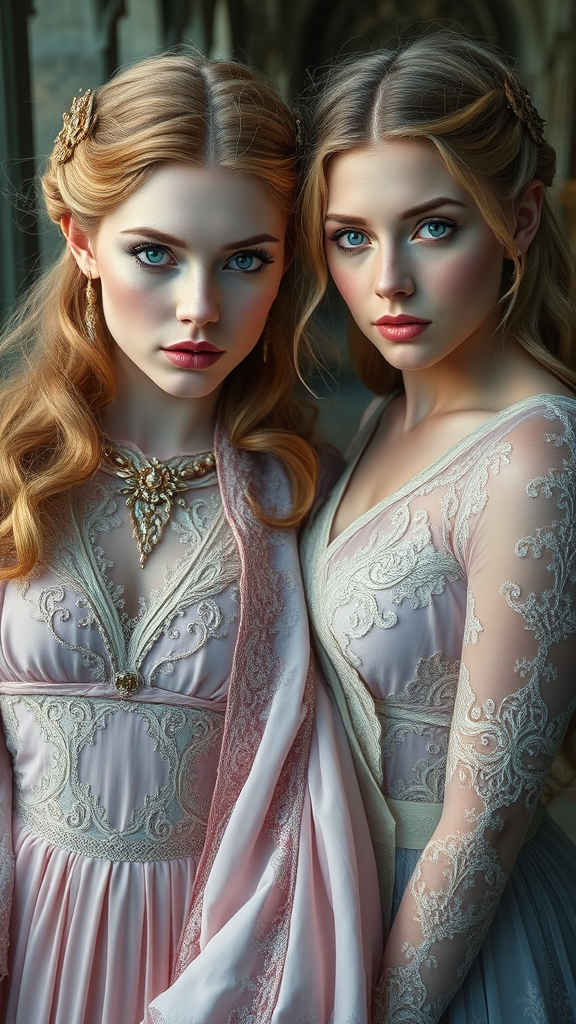 Elizabeth Olsen and Bryce Dallas Howard portrayed as a modern Persephone from Greek mythology, featuring visually stunning and captivating eyes, embodying the allure of pastel colors. They wear an elaborate, intricately designed dress, reminiscent of a one-piece ensemble, with symmetrically proportioned bodies. The scene captures the essence of detailed and cinematic lighting, with high contrast highlighting their features, standing in a full-body pose. The artistic style resembles an oil painting in the style of Apterus, suitable for an Artstation-level illustration or portrait, with small creative modifications enhancing the enchanting atmosphere.