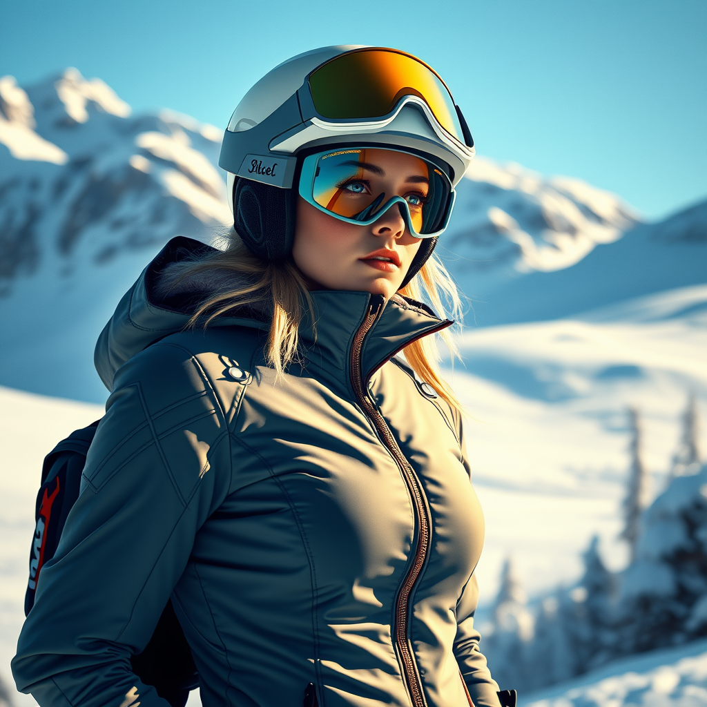 Elle Fanning, a woman wearing a fitted ski suit, stands amid a snowy mountain landscape, art style inspired by WLOP, Artgerm, Peter Mohrbacher, and Krenz Cushart. The scene is illuminated by stunning natural and volumetric lighting, capturing the elegance and sophistication of her Sunday ski fashion with a modern twist. The composition boasts a vibrant color palette that is both avant-garde and eye-catching, with a focus on intricate details and smooth shading that highlight the masterpiece's beauty and elegance.