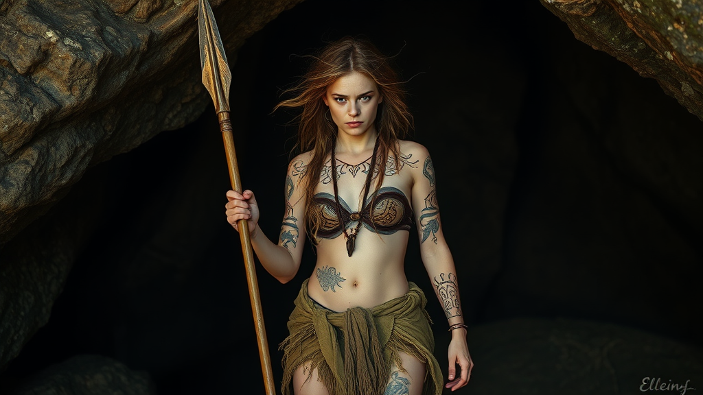 Elle Fanning in a prehistoric setting, a lone woman in the stone age dressed in a primitive loin cloth, her hair wild and untamed. She bears tribal tattoos that tell an ancient story, clutching a spear for survival. Her expression is one of heightened awareness and caution, standing at the entrance of a shadowy cave. The scene is depicted in ultra-realistic detail, capturing an 8k resolution with the meticulous artistry reminiscent of Boris Vallejo and Frank Frazetta. The environment conveys both the raw beauty and danger of this ancient world, with a focus on the intense mood and vivid textures.