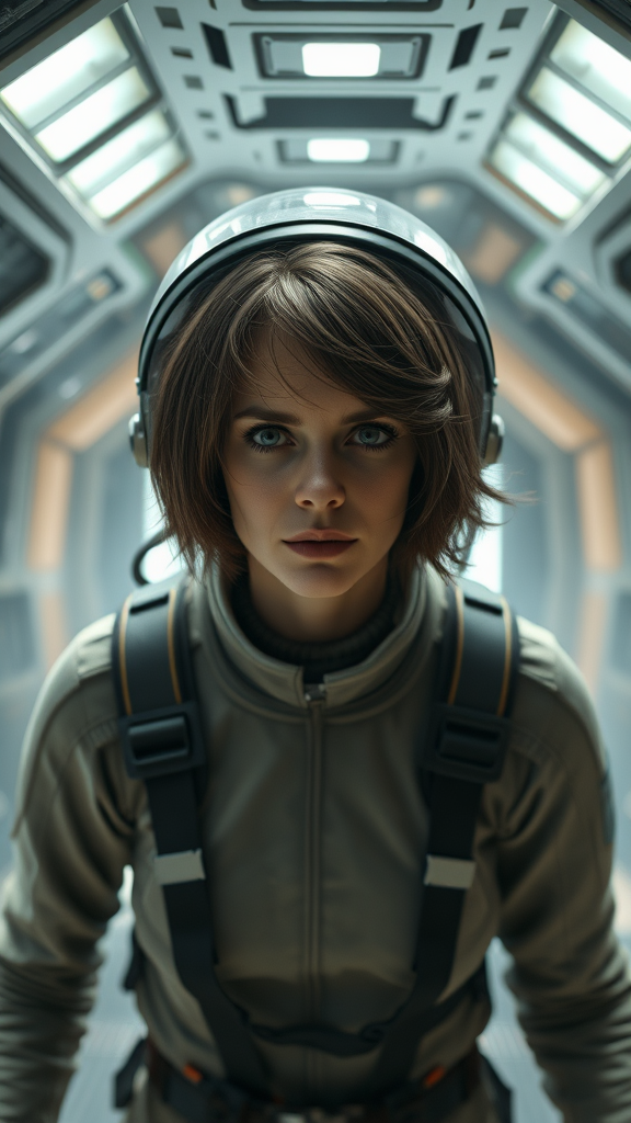 Ellen Ripley as the central figure of the Alien movie, featuring brunette hair with realistic movement, wearing an astronaut suit and helmet, set against the detailed interior of the Sulaco spaceship with volumetric fog, embodying a sci-fi atmosphere, created in Cinema4D, ultra-realistic 8K. The scene is characterized by elements of distortion, including deformed and blurry features, inaccuracies in anatomy, with disfigured and poorly drawn hands and face, presence of floating and missing limbs, and disjointed facial and bodily proportions, such as an elongated head and body, and squinting eyes.