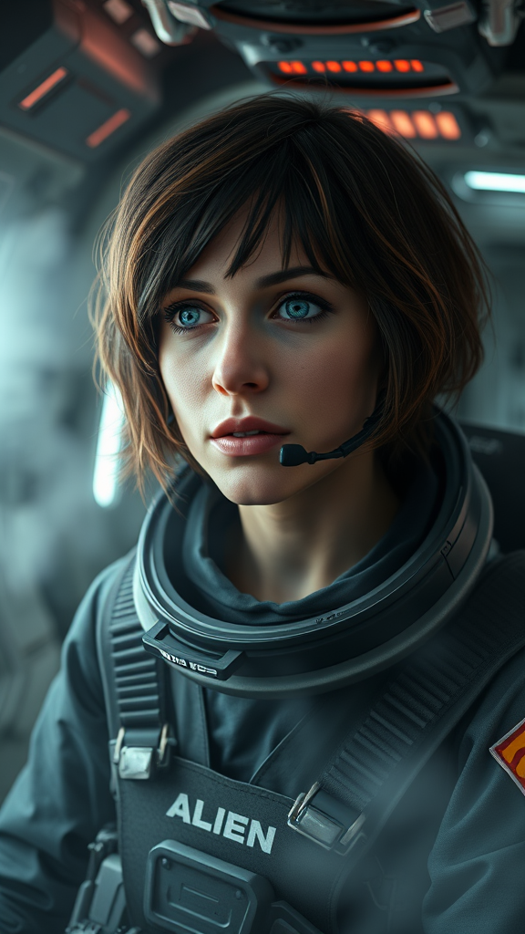 Ellen Ripley as the face of the Alien movie, with brunette short hair showing real hair movement, dressed as an astronaut with a helmet, set against the detailed interior of the Sulaco spaceship. The scene is enveloped in volumetric fog, creating a sci-fi atmosphere captured in ultra-realistic 8K quality using Cinema4D. The depiction intentionally plays with deformations and anomalies, featuring a blurry representation with disfigured aspects like poorly drawn hands and face, floating and disconnected limbs, an elongated head and body, and a squinting eye, all contributing to a surreal and distorted interpretation of the iconic character.
