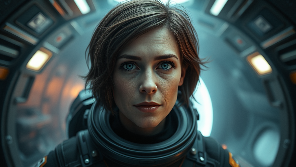 Ellen Ripley as the iconic face of the Alien movie, featuring brunette short hair with realistic movement, dressed as an astronaut with a helmet, set against the richly detailed interior of the Sulaco spaceship, enveloped in volumetric fog, capturing the essence of sci-fi, rendered in Cinema4D for an ultra-realistic 8K result, with intentional distortions such as deformed and blurry features, inaccurate anatomy, disfigured and poorly drawn hands and face, floating or missing limbs, disconnected features, elongated head and body, and a squinting eye, maintaining a surreal yet recognizable depiction.