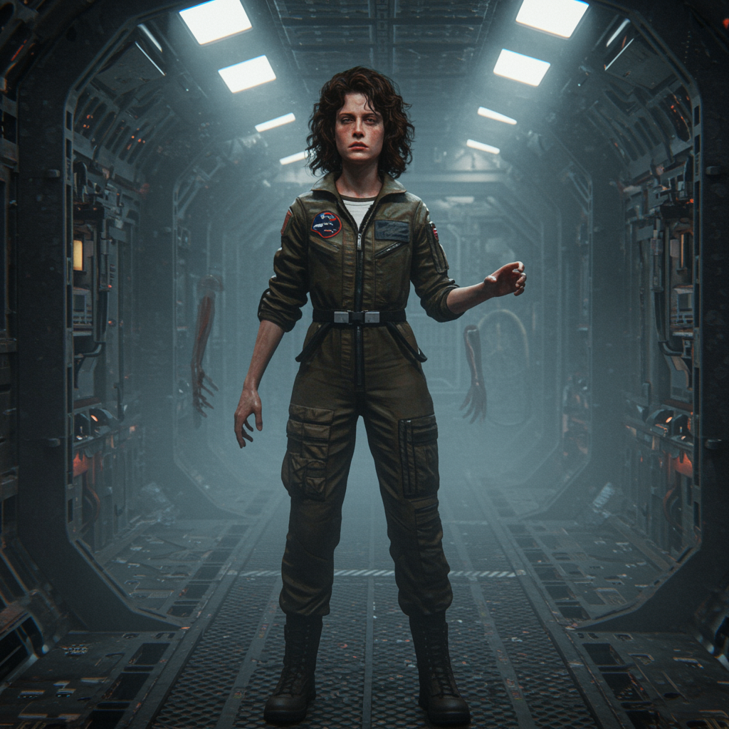 Ellen Ripley as the iconic figure in the Alien movie, featuring her signature brunette, short hair with realistic movement, dressed as an astronaut with a helmet, set against the intricately detailed interior of the Sulaco spaceship. The scene is enveloped in volumetric fog, capturing a sci-fi essence with a Cinema4D ultra-realistic 8K render. Despite the hyper-realistic setting, there are surreal elements: distorted anatomy, blurred features, and disfigured structures. Her hands and face are poorly drawn, while limbs appear to float, missing or disconnected, with a long head and body, and eyes that squint, adding an eerie, dream-like quality.