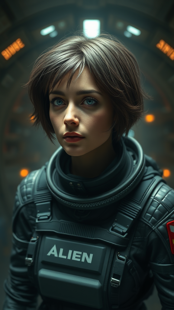 Ellen Ripley as the iconic figure of the Alien movie, with short brunette hair showing realistic movement, in an astronaut suit with a helmet, set against the intricate background of the Sulaco spaceship interior, bathed in volumetric fog, capturing a sci-fi essence. Created in Cinema4D, presented in ultra-realistic 8K resolution, with intentional artistic distortions like deformed features, blur, anatomical irregularities, disfigured forms, poorly drawn hands and face, floating, missing, or disconnected limbs, an elongated head and body, and a subtly squinting eye, all while maintaining the essence and tension of the original concept.
