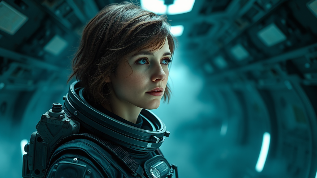 Ellen Ripley as the iconic figure of the Alien movie, with short brunette hair exhibiting natural movement, wearing an astronaut suit with a helmet; set against the detailed backdrop of Sulaco spaceship interior, filled with volumetric fog, exemplifying a sci-fi aesthetic in ultra-realistic 8K resolution. Subtle creative shifts include exaggerated proportions; slightly distorted anatomy with an elongated face and body, giving a surreal effect; her expression includes a slight squint, and limbs appear in various stages of detachment, evoking a dreamlike disconnection fitting the ominous and intense atmosphere of the scene.