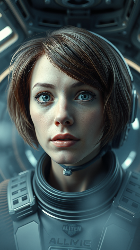 Ellen Ripley face of Alien movie, brunette, short hair, realistic hair movement, astronaut, helmet, against the backdrop of detailed Sulaco spaceship interior, enveloped in volumetric fog, sci-fi atmosphere, Cinema4D, ultra-realistic 8K resolution, slightly distorted, subtly blurred anatomy with unique artistic flair, creatively exaggerated features, unusual limb positioning, anatomically inventive, imaginative portrayal, slightly elongated face and silhouette, intriguing gaze.
