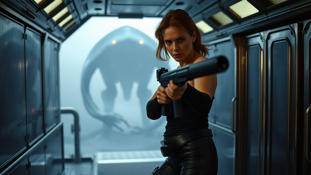 Ellen Ripley, fierce and determined, stands in a dynamic action pose aboard a dimly lit space vessel, her iconic flamethrower poised and ready. Her expression is intense, reflecting the high stakes of her mission. The metallic walls of the ship glimmer with subtle reflections, and ambient lighting casts sharp shadows, enhancing the drama of the scene. In the background, faintly visible through a misty haze, are the eerie outlines of the alien architecture, adding an extra layer of tension. This epic cinematic moment captures Ripley as a sci-fi hero with grit and resolve, set against a backdrop of otherworldly intrigue.