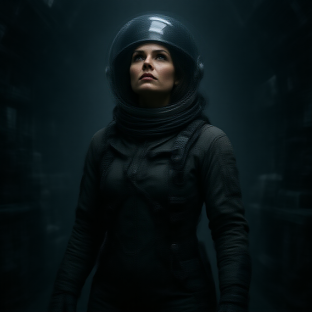 Ellen Ripley from the Alien movie in an epic cinematic 8k wallpaper, wearing an astronaut suit with the helmet on and visor closed, gazing upwards in an action pose amidst the intricate interiors of the Nostromo space shuttle. This sci-fi scene features ultra-high detail, blending realistic chiaroscuro lighting and sophisticated Ray Tracing. Enhanced with overcast reflection mapping, the image radiates hyperphotorealistic quality, showcasing a stoic presence with rim lighting. The promotional art captures a movie-quality essence, as if shot on a Canon 5D with Octane Render, in ultra-realistic and meticulously detailed 8K resolution, presenting an epic, immersive visual narrative.
