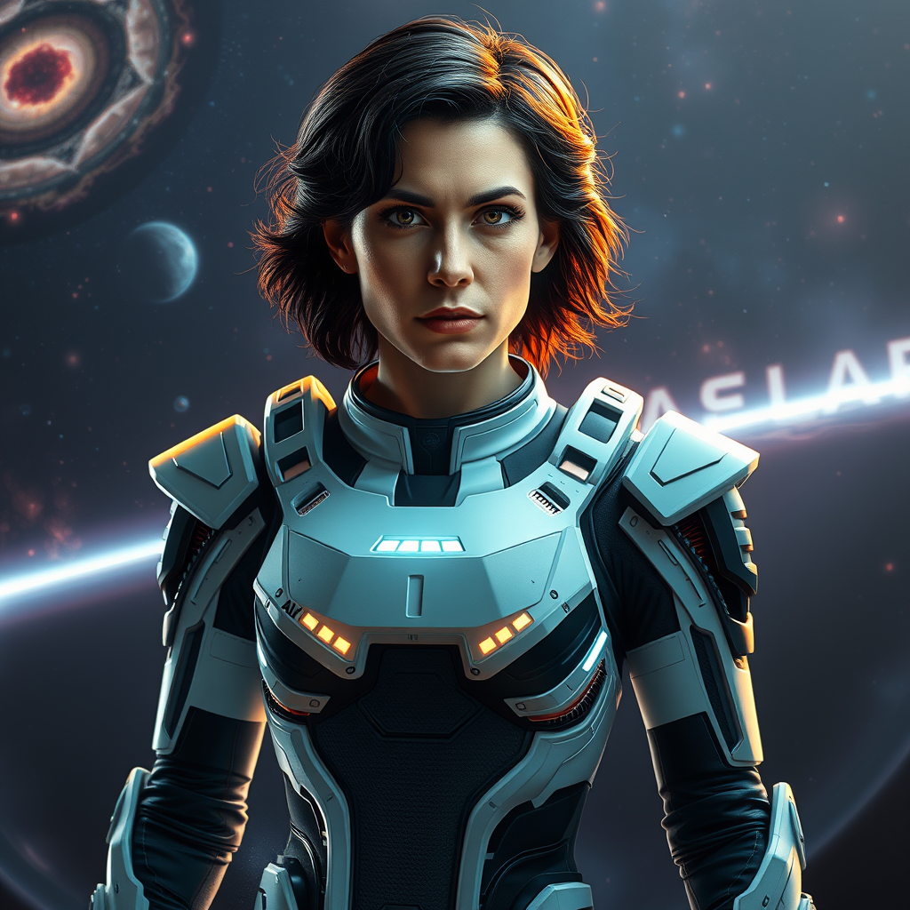 Ellen Ripley in a futuristic sci-fi setting, clad in advanced space armor with subtle neon accents, standing against a dramatic cosmic backdrop filled with swirling galaxies and a distant nebula, her expression determined and fierce, cinematic lighting casting dynamic shadows to emphasize her features, octane render, 8K resolution, capturing a blend of heroic and mysterious ambiance.