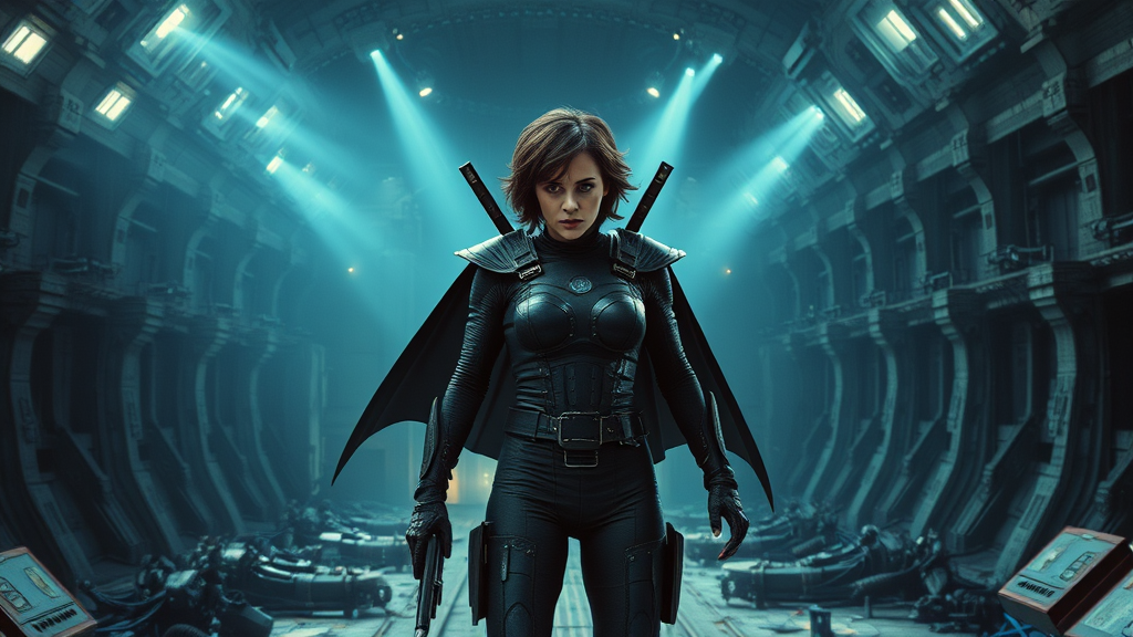 Ellen Ripley in dark cybernetic armor, wielded pair of cape billowing blades laid across her shoulders, stands heroically at the edge of a massive abandoned engineering deck on the derelict Nostromo, beams of soft blue light illuminating her rugged visage amidst the remnants of machinery and debris.