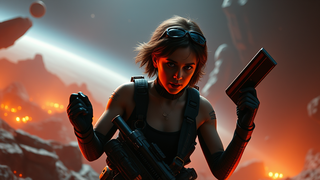 Ellen Ripley in epic cinematic style, surrounded by the dramatic glow of futuristic space landscape, detailed octane render, hyper-realistic textures, intense atmospheric lighting, 8K ultra-high-definition, dynamic action pose with her iconic gear, vibrant contrast between shadows and highlights, capturing the essence of sci-fi heroism.