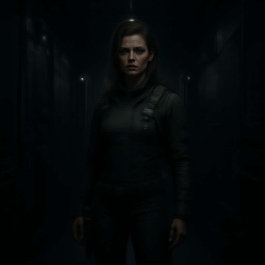 Ellen Ripley stands in a futuristic, industrial spaceship corridor, bathed in dramatic shadows and flickering emergency lights, her determined gaze fixed ahead. She is clad in her iconic, weathered jumpsuit, with hints of sci-fi weaponry and advanced technology visible at her side. The metallic walls and exposed pipes of the ship exude realism and texture, reflecting the intense atmosphere of high-stakes adventure. The Octane Render accentuates the scene with stunning detail, highlighting every subtle wrinkle and contour, creating a breathtaking 8K cinematic experience that immerses you in a suspenseful universe.