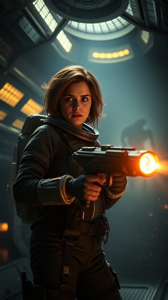 Ellen Ripley stands poised for action in an epic cinematic 8k wallpaper, her determined gaze set against the dark, foreboding interior of the spaceship Nostromo, bathed in the eerie glow of flickering lights. Wearing a futuristic space suit with slight modifications for a more modern touch, Ripley grips a reimagined version of the iconic flamethrower. Her hair is tousled from the fight, adding to the intensity of her expression. The alien threat looms faintly in the background, partially obscured by shadows, enhancing the tension and drama of the scene. Dust particles float in the air, catching the stray beams of light, creating a sense of depth and motion.
