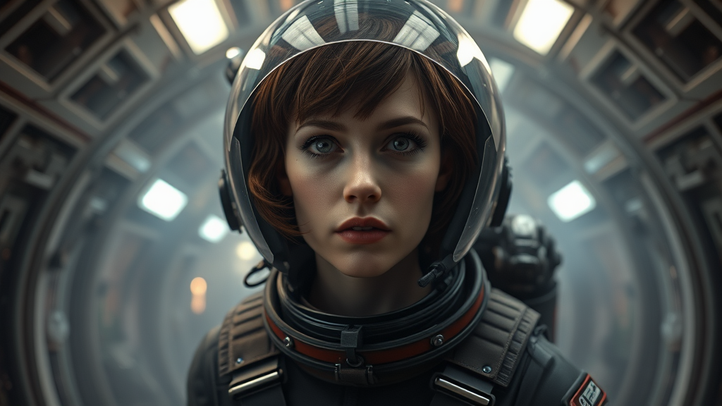 Ellen Ripley, the iconic face of the Alien movie, portrayed with brunette short hair capturing real hair movement, is seen as an astronaut in her helmet. She stands against the intricate background of the Sulaco spaceship interior, enveloped in volumetric fog, embodying a sci-fi aesthetic. Created with Cinema4D, this ultra-realistic 8K image includes intentional artistic distortions like deformed, blurry features; bad anatomy; and disfigured elements such as poorly drawn hands and faces. Her form is depicted with floating, missing, and disconnected limbs, featuring a stretched head and elongated body, along with squinting eyes, evoking a surreal, dream-like interpretation that retains the essence of the original inspiration.
