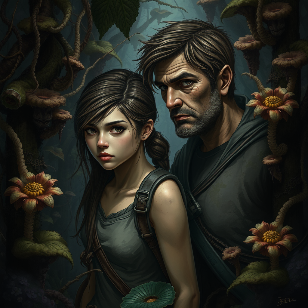 Ellie from The Last of Us, in a detailed dystopian scene, a teenage girl and an adult male amidst overgrown vegetation and fungal growth, dark lighting creating an eerie atmosphere, inspired by the styles of Charlie Bowater and Gabrielle Ragusi, featuring intricate textures and lifelike expressions, with careful attention to anatomical accuracy, avoiding long necks or any distorted forms, all set in a vertically oriented composition.
