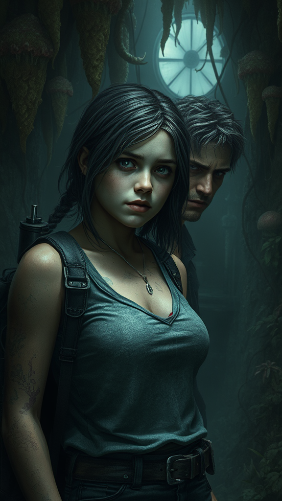 Ellie from The Last of Us, teenage girl, set in a highly detailed dystopian scene, accompanied by an adult male survivor; the environment is shrouded in dark lighting with an eerie atmosphere, overtaken by creeping fungus and wild vegetation. The scene embodies the artistic style of Charlie Bowater and Gabrielle Ragusi, capturing the grim yet captivating essence of their journey. The focus is on realistic anatomy and proportions, avoiding elongated features or multiple facial elements. The composition is vertical, emphasizing the towering and overgrown surroundings.