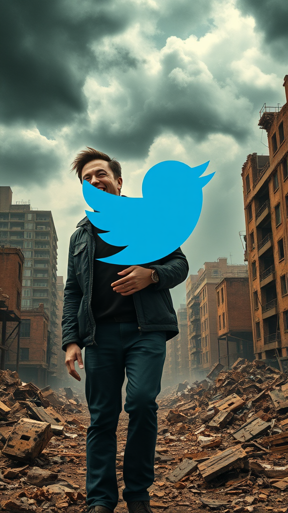 Elon Musk, caught in a fit of hysterical laughter alongside a vibrant blue Twitter bird, stands amidst a post-apocalyptic landscape, where crumbling buildings reach towards a stormy sky. The scene captures the chaotic energy with photorealistic detail, emphasizing the stark contrast between the bright bird and the desolate surroundings, evoking a sense of surreal comedy amidst destruction.