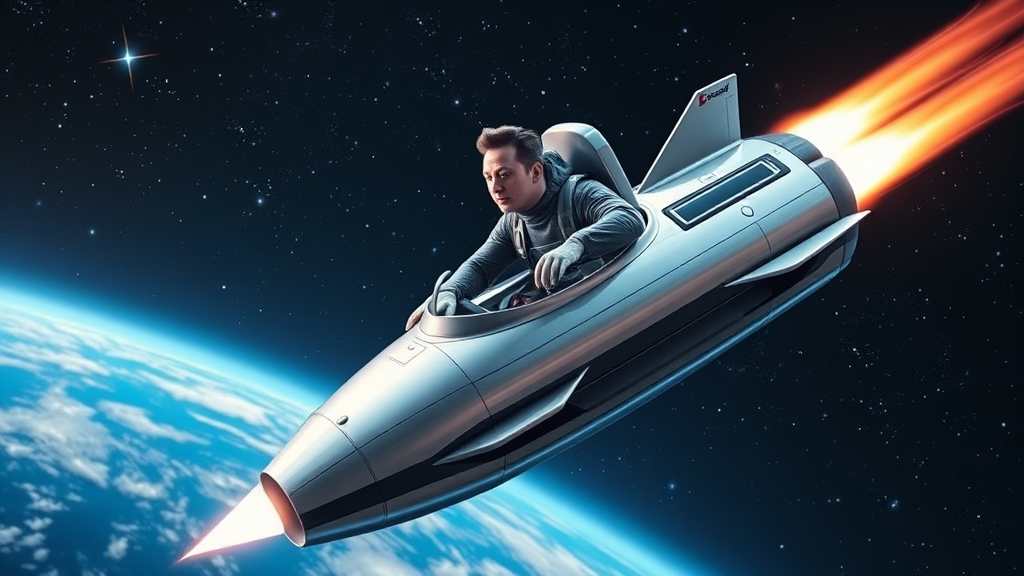 Elon Musk, clad in a sleek space suit, pilots an ultramodern, streamlined toy rocketship, its metallic surface gleaming under the starlight, as it gracefully navigates the cosmic expanse with Earth’s vibrant hues visible in the distance, surrounded by twinkling stars and the serene glow of distant galaxies.