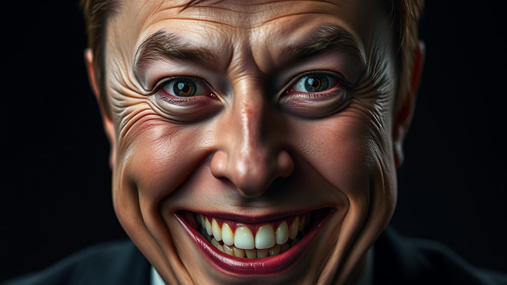 Elon Musk depicted with deep skindentation and strikingly bright, realistic eyes, showcasing a wide, mischievous grin. The scene is captured as a masterpiece under studio lighting, with an element of darkness subtly enhancing the overall atmosphere, creating an intense and intriguing portrait.