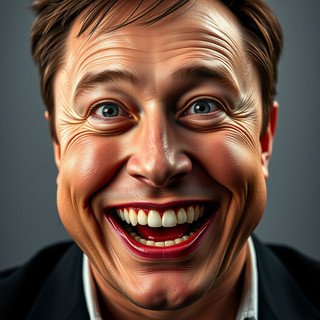 Elon Musk depicted with strikingly detailed skin texture, his eyes shining with a vivid, lifelike brightness, showcasing an enormous, mischievous grin that exudes a sense of bold ambition. Rendered in a masterful style under expert studio lighting, the composition holds a slightly shadowy ambiance.
