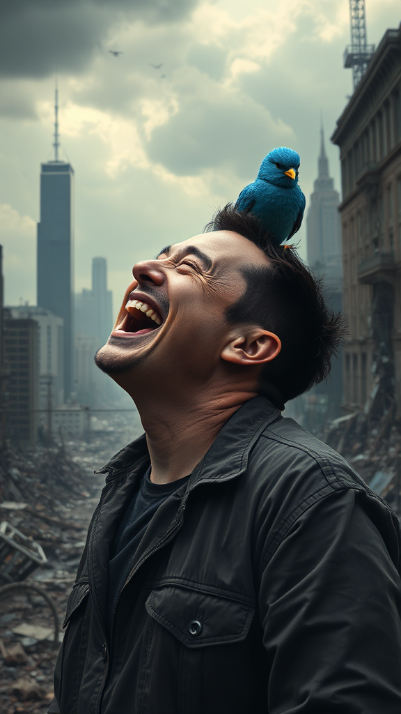 Elon Musk doubled over in uncontrollable laughter, the blue Twitter bird perched on his shoulder, surrounded by a post-apocalyptic landscape of crumbling skyscrapers and darkened skies, depicted in a photorealistic style, capturing a mood of chaotic amusement amidst urban ruins.