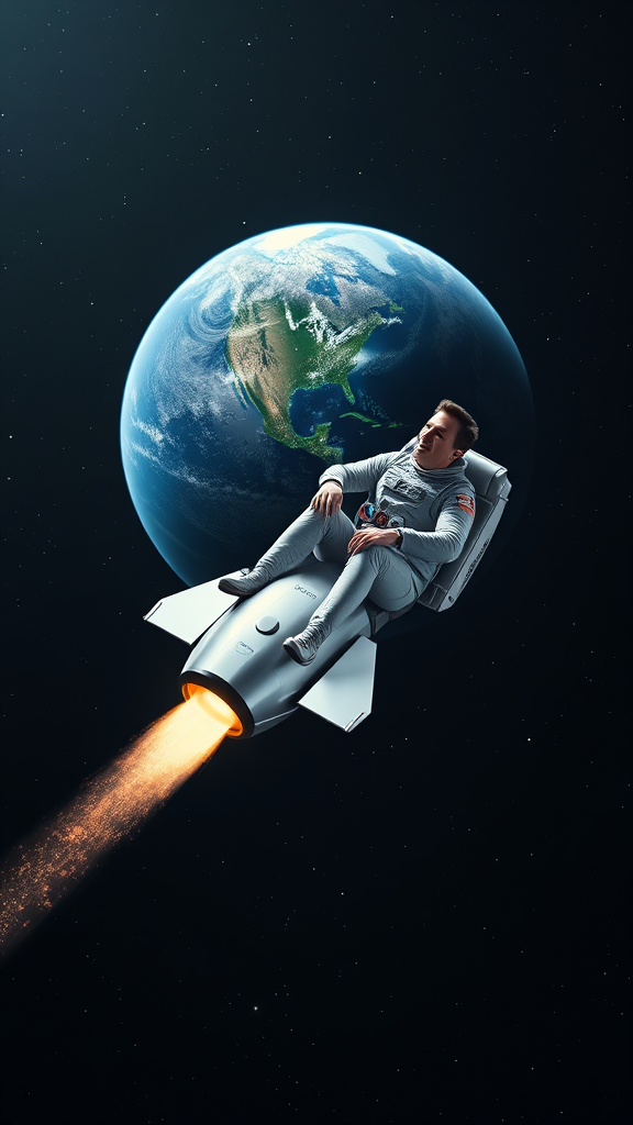 Elon Musk elegantly maneuvers a sleek, ultramodern toy rocketship across the vast expanse of space, its surface glistening under the distant glow of stars. The craft, adorned with subtle neon accents, cuts through the cosmic tapestry like a silver arrow. Earth looms majestically behind him, a vibrant globe of swirling blues and greens contrasting with the endless black void. As the toy rocketship soars gracefully, cosmic dust sparkles in its wake, creating an ephemeral trail of light. Elon, in a casual space suit with playful insignias, appears both visionary and whimsical, perfectly embodying the spirit of exploration and innovation.
