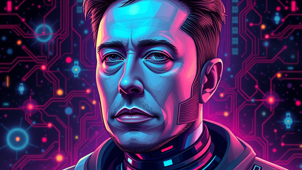 Elon Musk futuristic cybernetic portrait in SAI style intricate pixel art, showcasing a fusion of technology and human ingenuity, set against a galactic backdrop with vibrant neon tones and digital circuitry motifs